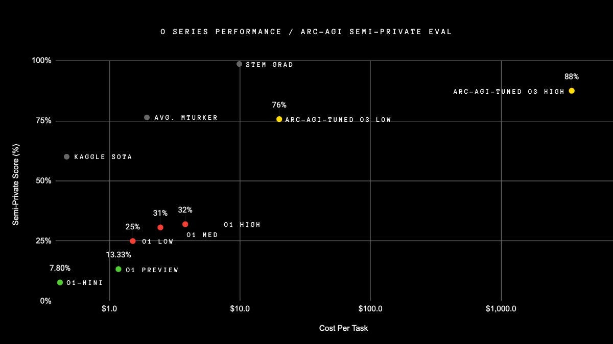 The fact that a human STEM graduate is included in the benchmark highlights just how challenging these tasks are and how far AI has come. It really underscores the potential of o3 and its implications for the future of AI.