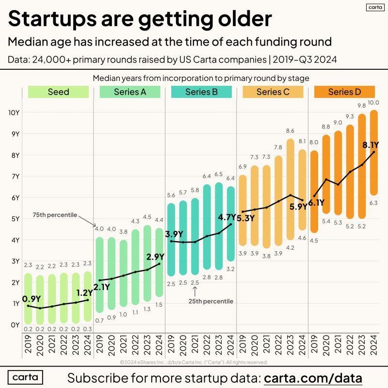 → Why does it matter? Building a successful company is taking longer than ever. It's a tough journey, with the average time to reach Series D now clocking in at 8.1 years—a significant jump of more than two years since 2019.