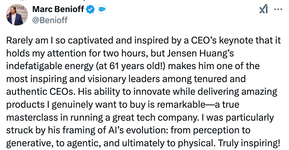 → Why does it matter? Earlier this week, Nvidia founder and CEO Jensen Huang delivered the CES 2025 keynote (worth watching on 1x speed—link below!). Even Marc Benioff, the G.O.A.T. of enterprise keynotes, was captivated for the full two hours!