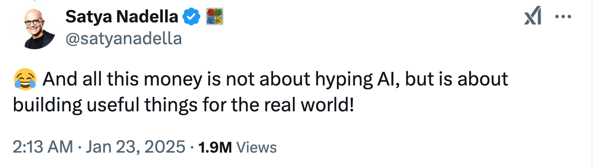 Others have said, 'Stargate' Squares Some AI Circles. One of the more memorable reactions came from Satya Nadella at Davos: “Look, all I know is I’m good for my $80B.” 🎤💥 Notably, Microsoft is not an official capital partner of Stargate on Day 1.
