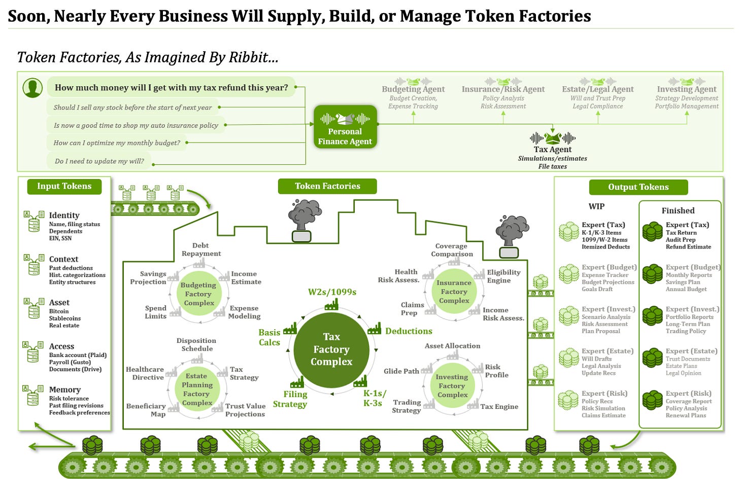 This is what Ribbit Capital calls a token factory: a system that not only records information but also produces the tokens that flow through it.