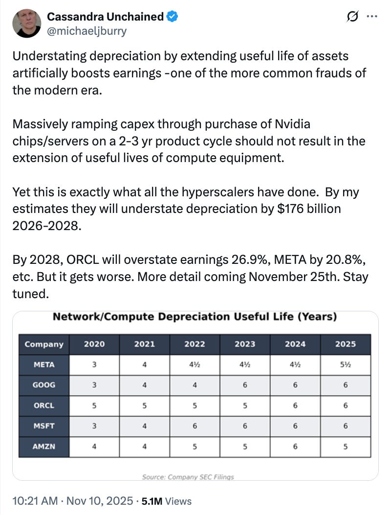 → Why does it matter? ‘Big Short’ investor Michael Burry accuses AI hyperscalers of artificially boosting earnings. He argues that extending chip “useful lives” is masking depreciation and flattering AI-era profits, a risk to valuations if assumptions snap back, with Oracle and Meta in the crosshairs. More from CNBC here. Since this writing, Burry has also potentially closed up shop. Follow him on X here.
