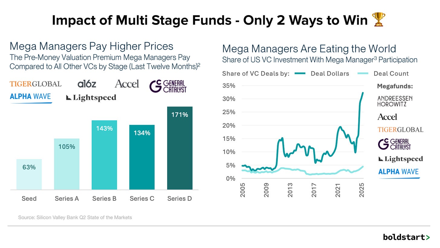 → Why does it matter? Venture has consolidated into an efficiency game. Mega managers use scale to buy access, paying steep premiums while crowding out smaller firms. The market now splits in two: giants who can afford to overpay and specialists who must outthink them. Everything in between is getting erased.