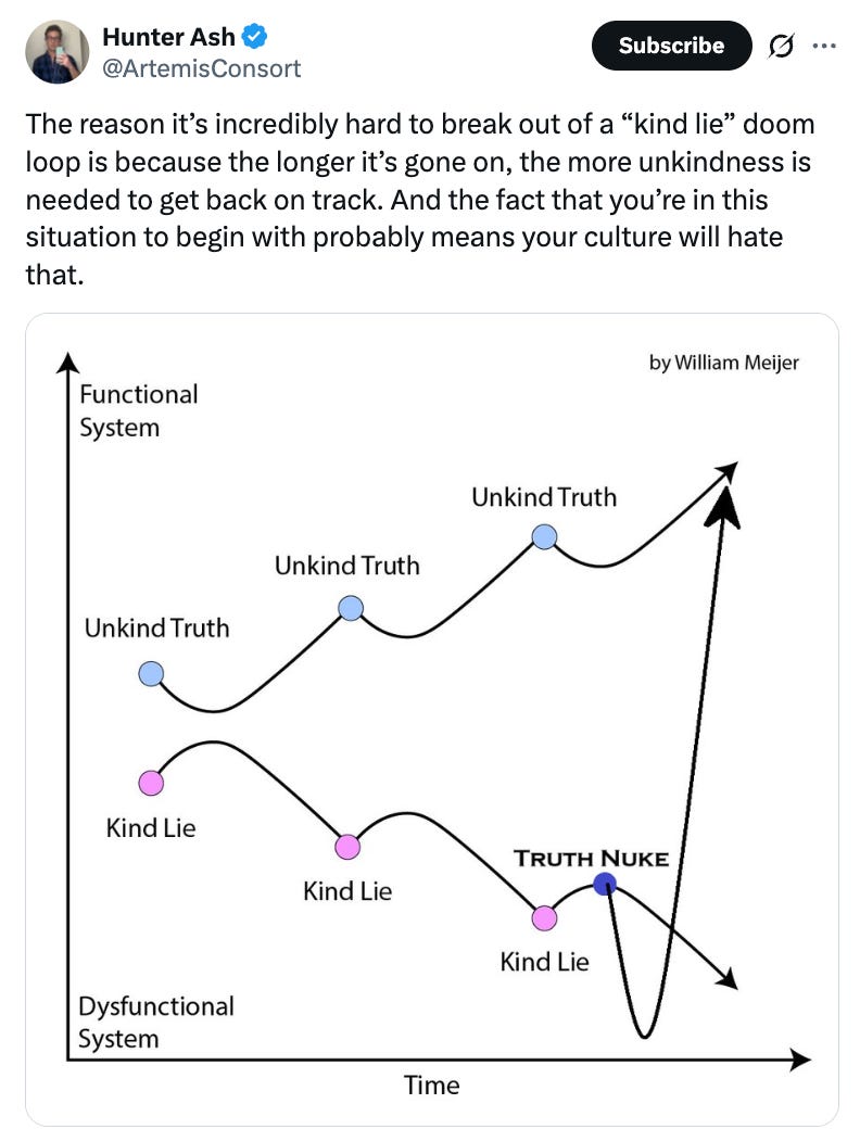 → Why does it matter? From the original author on X, William Meijer, “an extreme commitment to the truth makes relationships acutely dysfunctional but systems chronically functional. An extreme commitment to kindness makes relationships acutely functional but systems chronically dysfunctional.” The more kind lies, the bigger the ‘truth nuke’ ultimately becomes.
