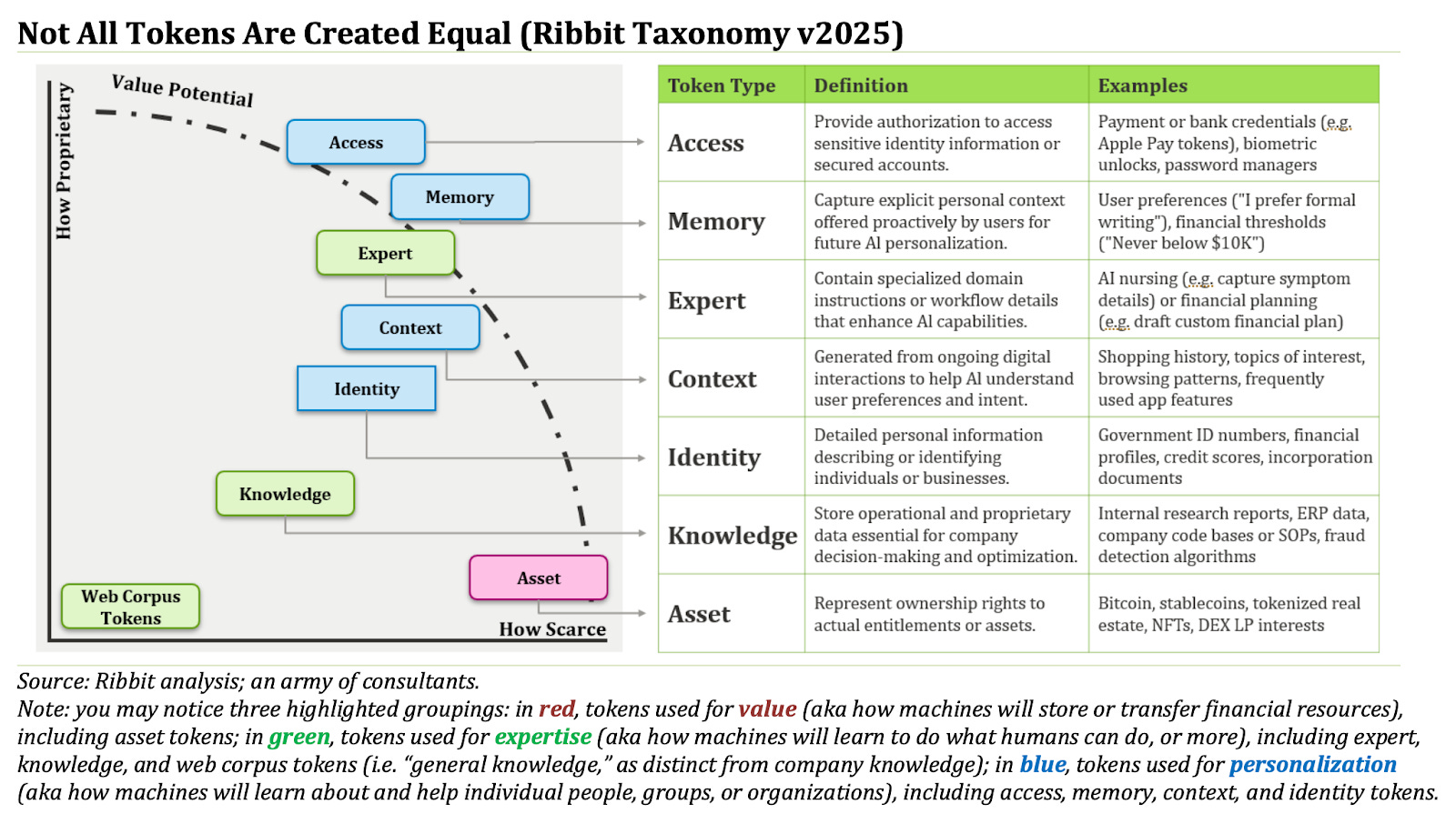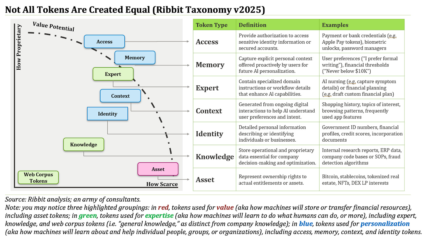 Over the next decade, there will be an explosion of all sorts of tokens. Ribbit Capital has done an exceptional job breaking it down by value stores (red), expertise (green), and personalization (blue). Their taxonomy is the clearest map available today.
