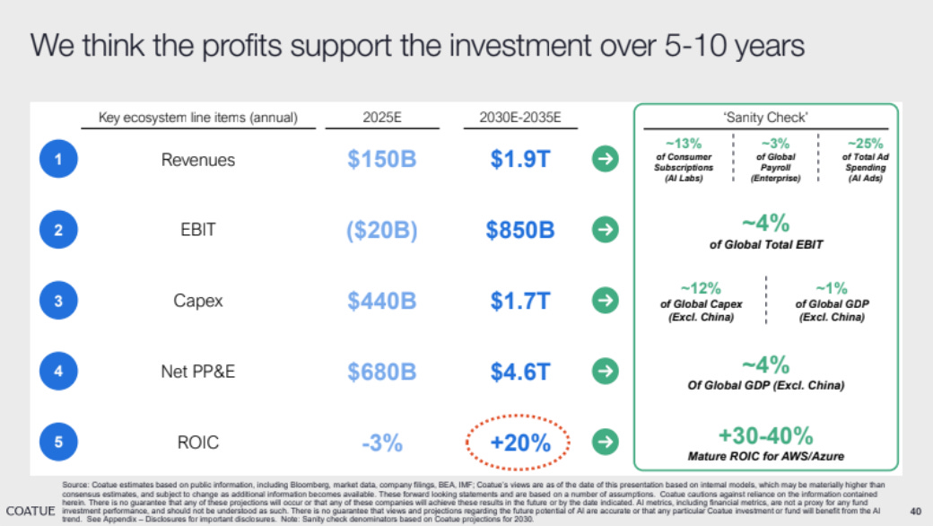 3/ AI is already generating measurable returns: productivity gains, cost savings, and new revenue streams across enterprises. Coatue pegs current AI revenues at $150 billion, with the potential to reach $1.5 to $2 trillion within a decade and generate roughly a trillion dollars in profits.