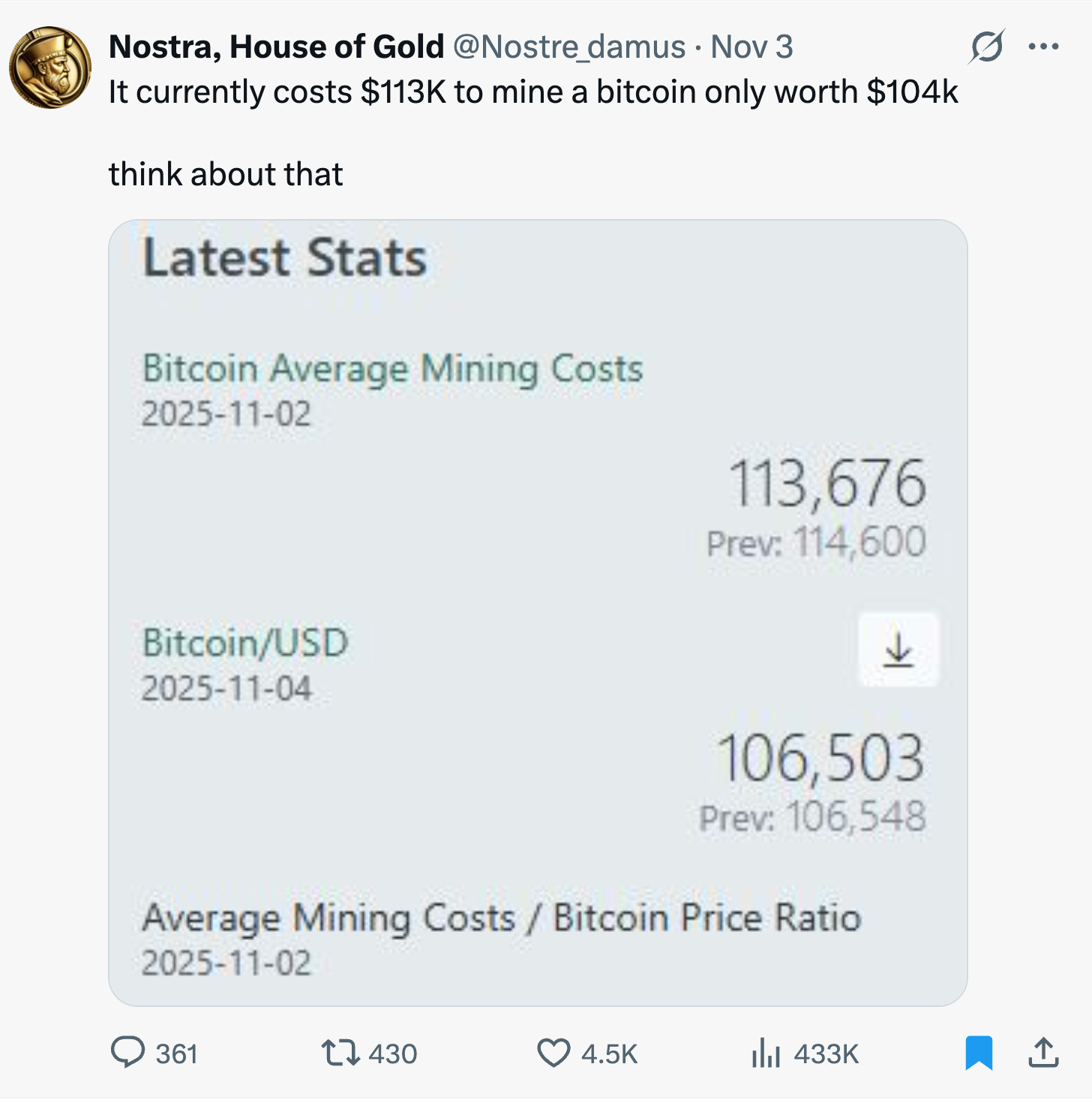 → Why does it matter? Due to the cost of computing and GPUs, it now costs more to mine a Bitcoin than Bitcoin is actually worth. For those wondering, this has happened before. More details in the tweet.