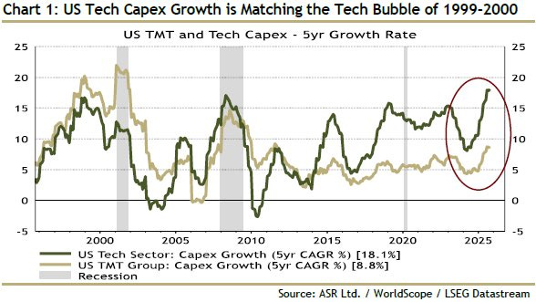 2/ AI capital spending has crossed 1% of GDP, a threshold last breached during the railroad boom and the dot-com era.