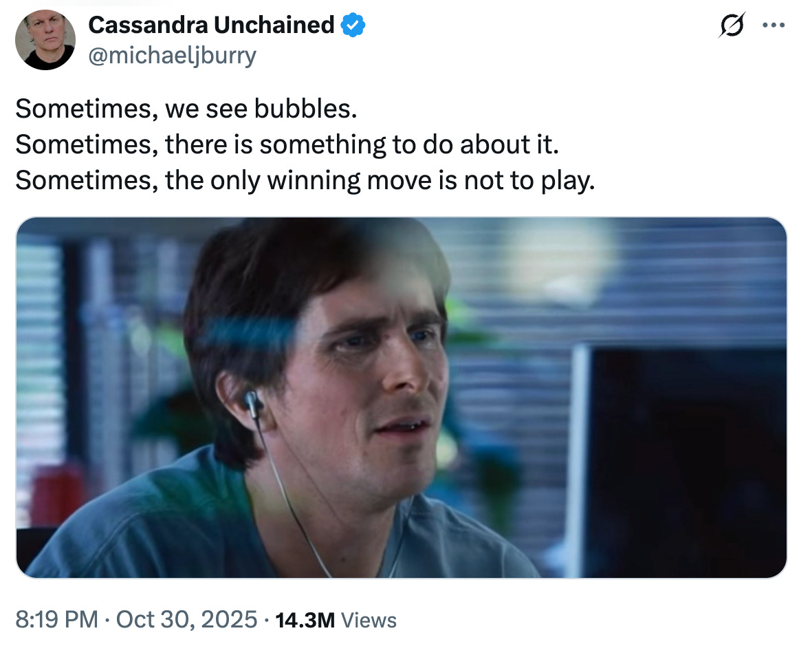 Scion Capital filed the disclosure weeks ahead of schedule. Funny timing, as the SEC is on PTO during the government shutdown. An oddly poetic detail for a market suspended between two interpretations of the same data.