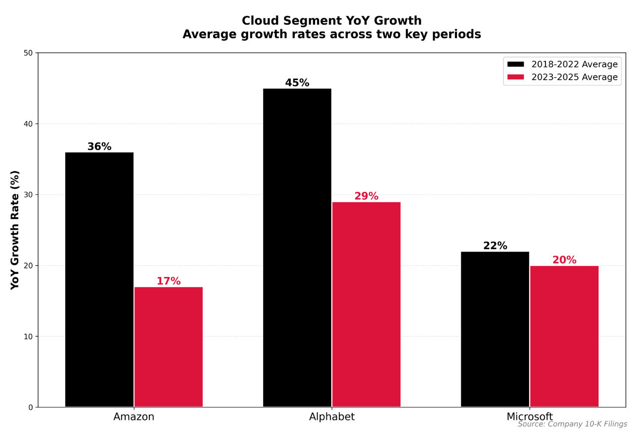 3/ Cloud revenue growth at Amazon, Microsoft, and Google has decelerated since 2022.