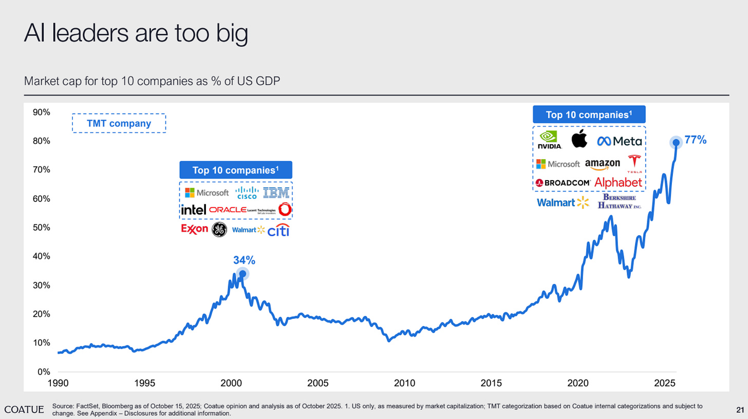 1/ The top ten companies now represent a larger share of market capitalization than at any time since 2000. What else happened in 2000? The dotcom bubble burst.
