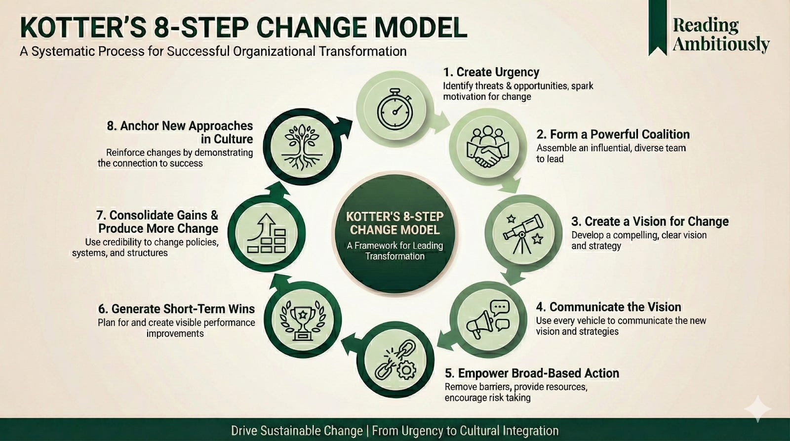 The first thing we suggest is to give yourselves a map for change. We like John Kotter. His central insight is that lasting change is a social process that follows a sequence. You build urgency, enroll the right people, make the future concrete, clear the path, and only then does behavior change.