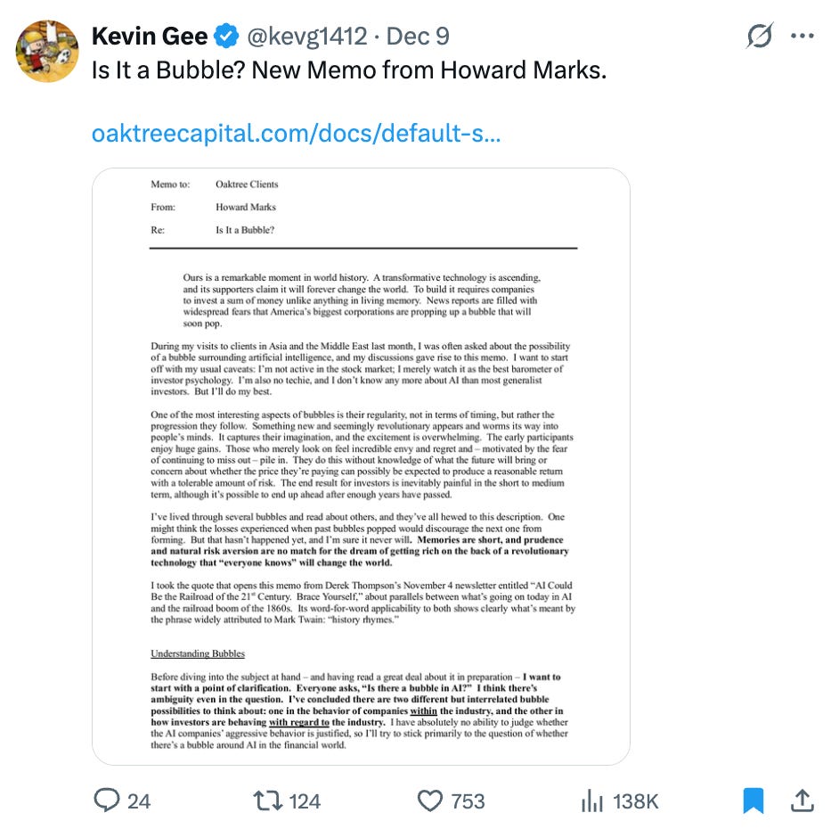 → Why does it matter? Howard Marks is back with his latest memo titled “Is it a bubble?” TL;DR: Here's the point - no one can know. Act prudently !