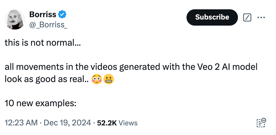 ā Why does it matter? Google's new Veo 2 is hereāand the example videos are mind-bogglingly good. Entirely AI-generated, it's a strong competitor to OpenAI's Sora. Veo 2 can create videos up to 4K resolution and several minutes long, surpassing Sora's capabilities.