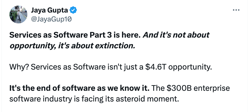→ Why does it matter? Foundation Capital has written a great series of blogs on “Service as Software” and AI Agents. Part 3 released this week explores how this opportunity impacts the enterprise software industry.