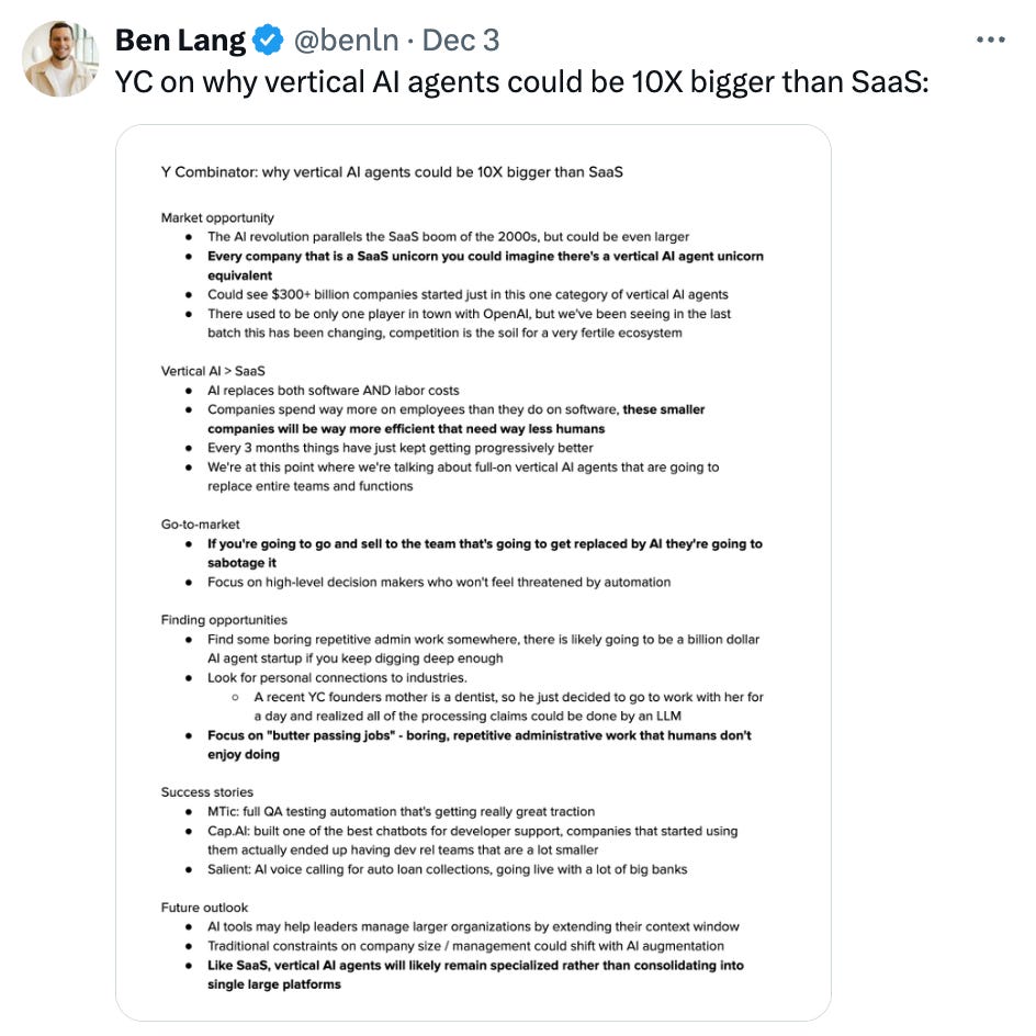 → Why does it matter? a16z’s Enterprise team highlights how AI is unlocking new markets for Vertical SaaS. Historically, building software for niche industries was too costly. Traditional SaaS sells tools customers must operate, but AI shifts this with “Service as Software.” AI agents now deliver outcomes directly, expanding market size by incorporating labor spend.
