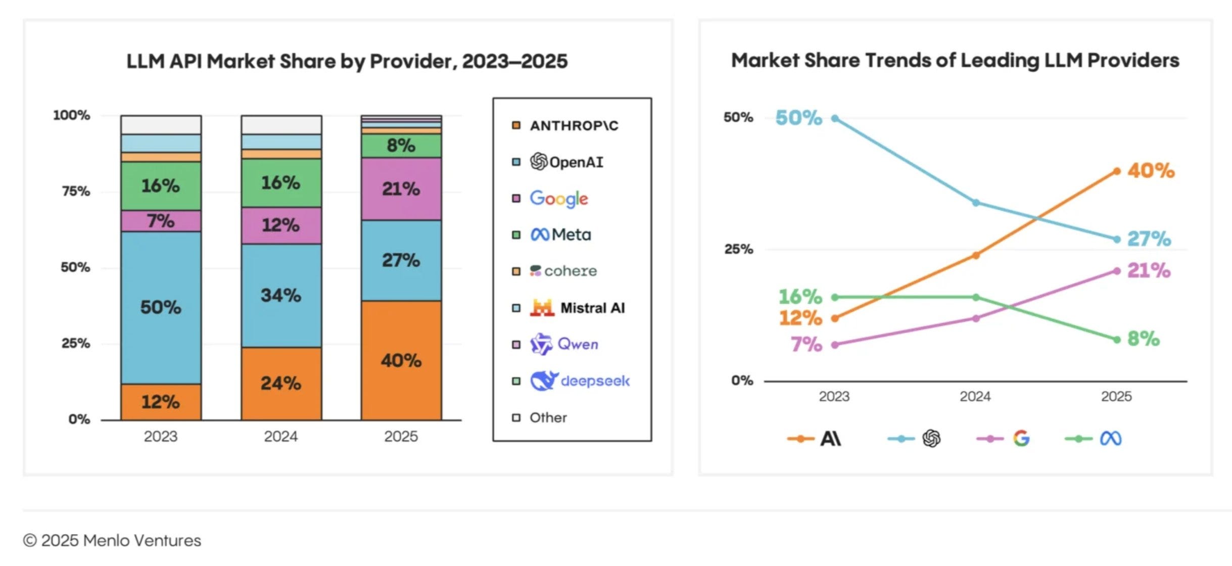 → Why does it matter? Enterprise market LLM share. Interesting to see Anthropic up and to the right as OpenAI focuses heavily on consumer.