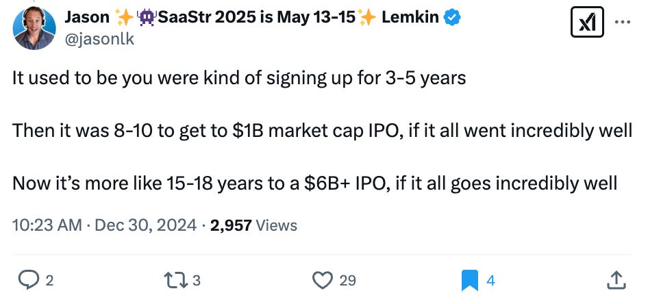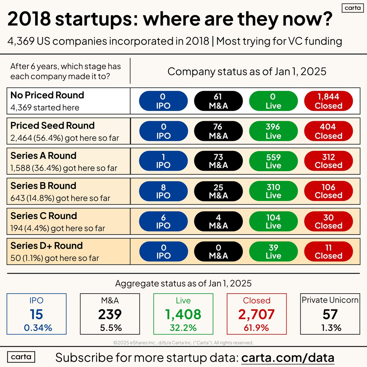 → Why does it matter? Building a successful company is taking longer than ever. It's a tough journey, with only 1% of companies founded in 2018 reaching Series D - and none going public yet. For founders and investors, this means planning for longer runways and focusing on sustainable growth. Jason Lemkin of SaaStr’s take is spot on.