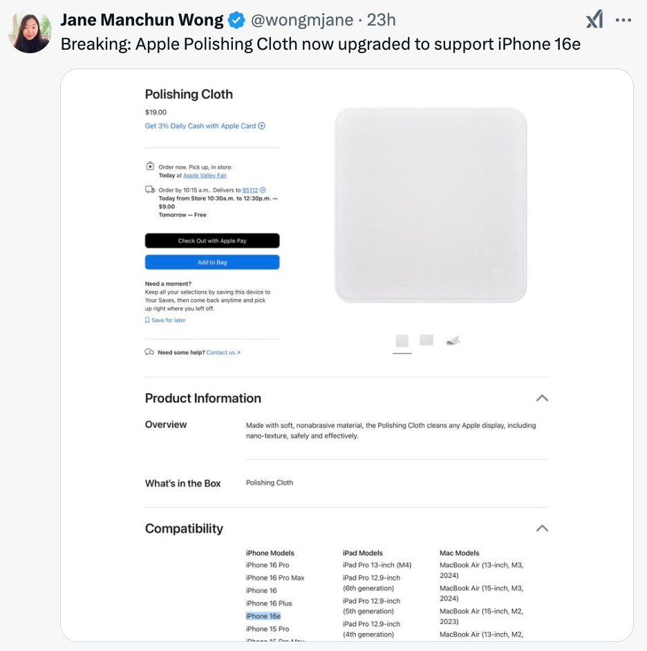 → Why does it matter? If you haven’t heard about Apple’s infamous $19 polishing cloth—a longtime punchline on the internet—it just got an upgrade. As of this week, it now supports the iPhone 16e. Yes, really.