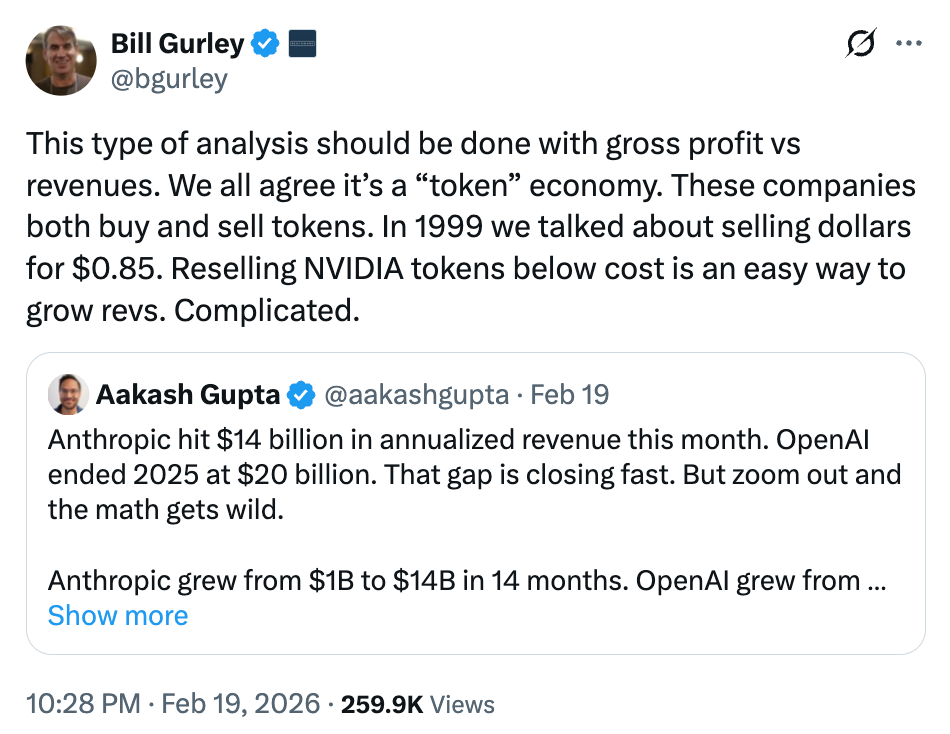 → Why does it matter? Bill Gurley is flagging the same trap that burned investors in 1999: revenue growth that looks spectacular until you ask what it actually costs to generate. If AI companies are buying compute from Nvidia and reselling it at a loss to win customers, the top-line numbers are a mirage.