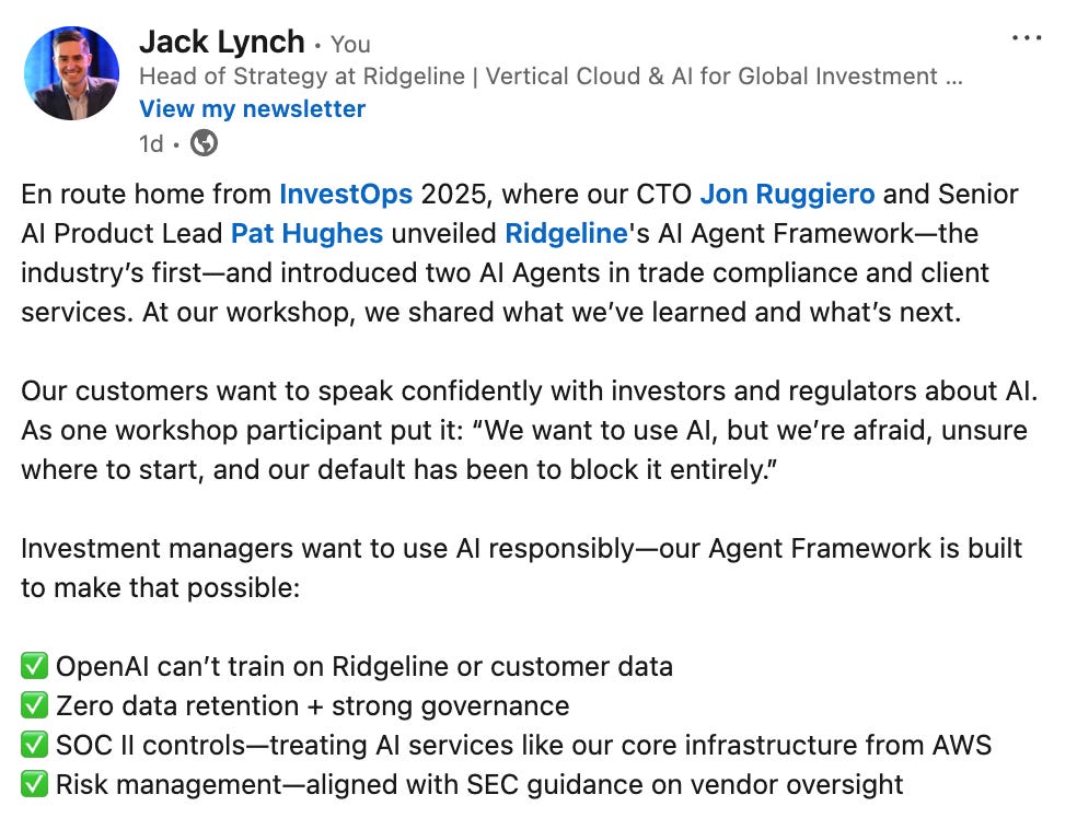 → Why does it matter? My own post didn’t stop my scroll, but I can’t help feeling proud after this weeks Ridgeline launch—an industry-first AI agent framework, purpose-built for global investment management. Our first two agents are live in trading compliance and client services!