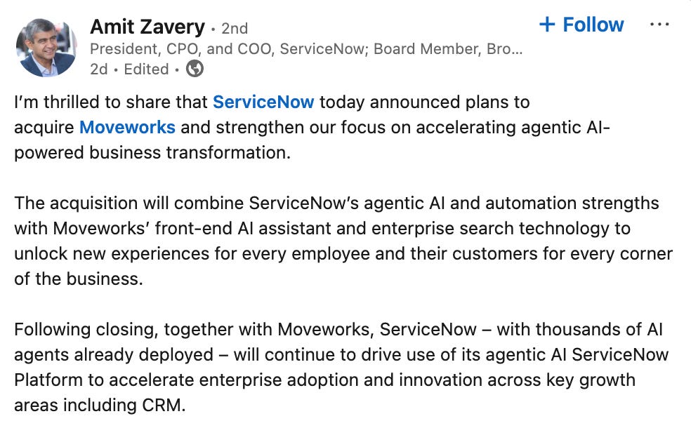 → Why does it matter? ServiceNow is acquiring Moveworks for $2.85B, adding generative AI chatbots for IT and HR automation plus a 500+ AI team. The deal positions ServiceNow to rival Salesforce in CRM, spotlighting 'enhanced customer experience' in the press release. Large-scale enterprise M&A like this has been rare recently—could this signal a new trend?