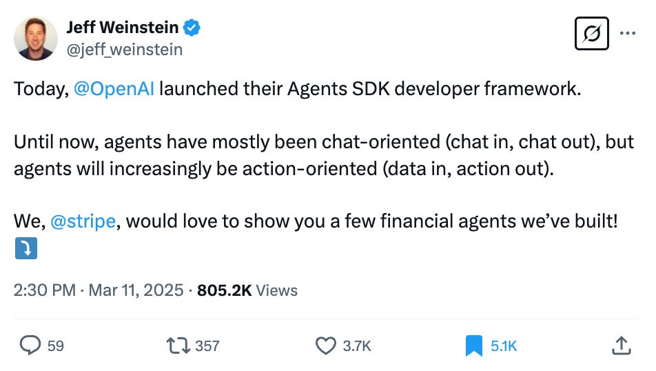 → Why does it matter? Stripe is using OpenAI’s new Agents SDK to build AI agents like autonomous invoicing and email support, shifting from chat-based to action-oriented workflows. The SDK to build Agents = selling to enterprise at OpenAI. Agents are expected to add $3B of revenues for OpenAI this year.