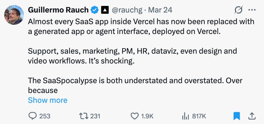 → Why does it matter? Guillermo Rauch is the Founder & CEO of Vercel. And his company has quickly become a favorite of AI builders. SORs are highly defensible. UIs not so much. Agents with CLIs and skills. API access. Feels like the future.