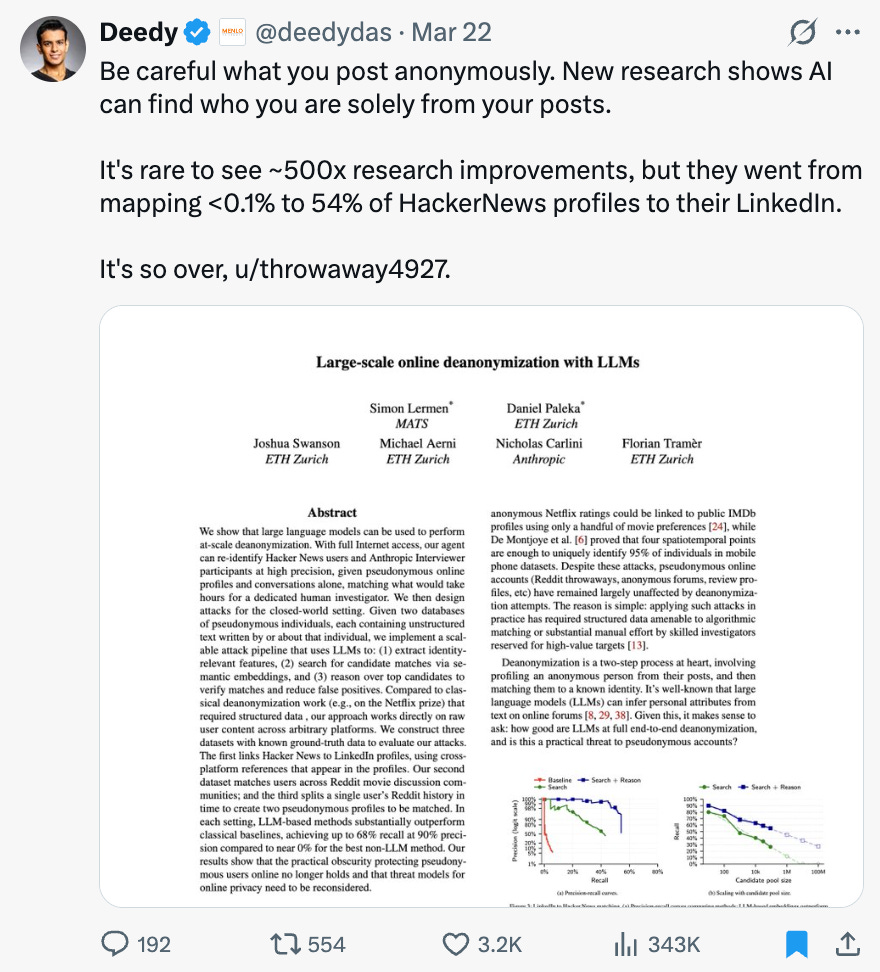 → Why does it matter? Researchers just demonstrated that anonymity online is functionally dead. LLMs can now cross-reference pseudonymous posts against real identity profiles at scale, moving from less than 0.1% to 54% match rates on HackerNews to LinkedIn. Yikes.