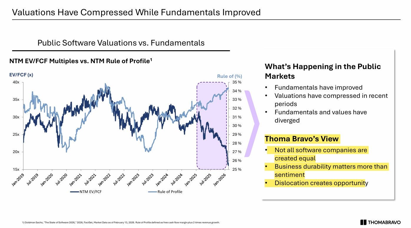 → Why does it matter? Thoma Bravo is one of the most sophisticated software investors on the planet, and their thesis here is precise: public markets are pricing software companies on sentiment, not fundamentals. The chart shows the Rule of 40 profile (a measure of real business quality combining growth and profitability) climbing steadily toward 35% even as EV/FCF multiples compress sharply, a divergence that only happens when fear is doing the pricing, not math. The crowd sells the category, the disciplined buyer buys the company. Not all software businesses will recover equally, but the ones with durable unit economics and sticky revenue are trading at a discount that history suggests will not last.