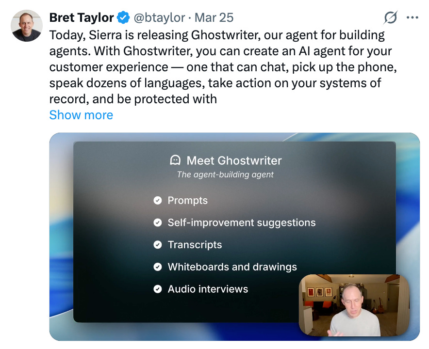 → Why does it matter? Sierra just shipped Ghostwriter. An agent that builds agents, removing the bottleneck of needing specialized AI talent to deploy customer-facing intelligence. If a platform can now handle voice, chat, multilingual support, and system integrations in one shot, the barrier between "we're exploring AI" and "we have AI in production" collapses.