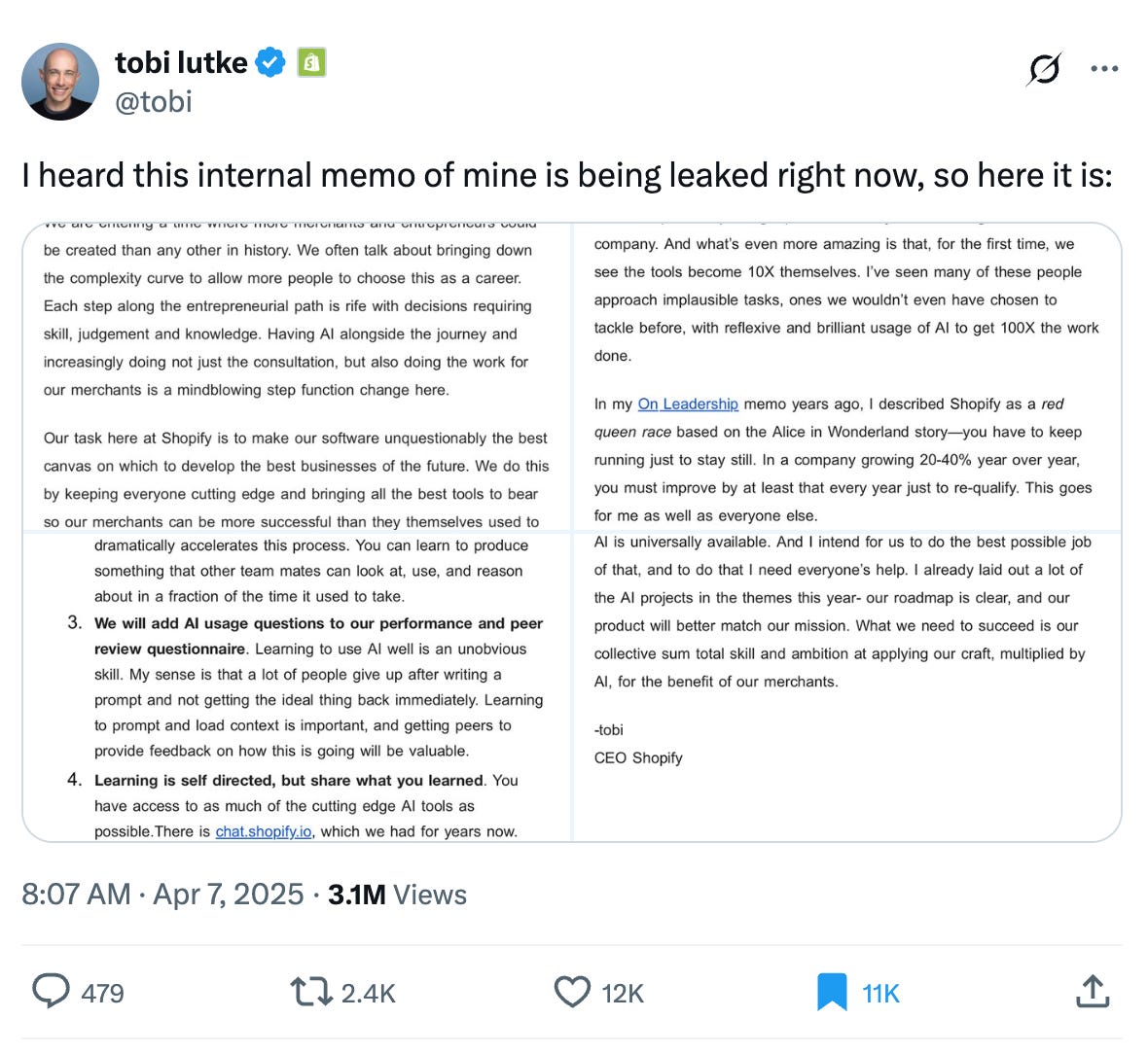 → Why does it matter? Shopify CEO Tobi Lütke just made AI a company-wide expectation. In a memo to employees, he encouraged teams to explore how AI could solve problems—before hiring people to do the same work. That might sound small, but it’s a big shift in mindset: AI-first, not people-first. This is part of a larger trend. Leaders are starting to see AI as a way to increase output per person, not just automate tasks. Shopify, for example, has grown revenue ~25% annually for a decade—while keeping headcount lean. Tobi’s bet? Tools like AI-powered translation and code refactoring can help them scale 10–100x without linear hiring.