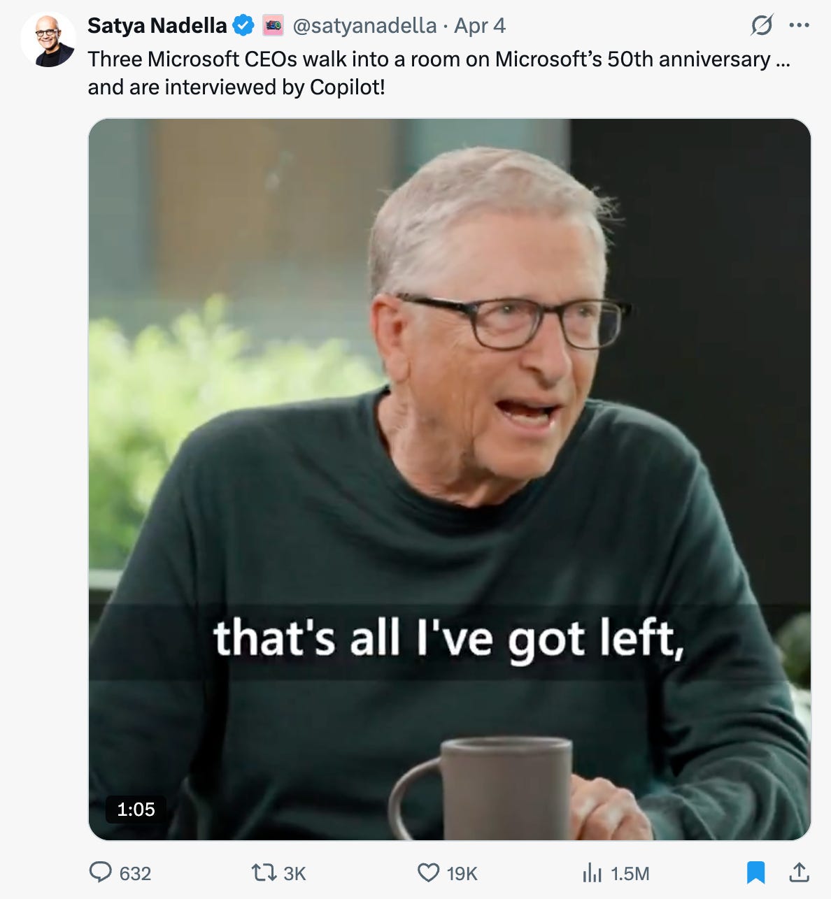 → Why does it matter? 50 years ago, Bill Gates started Microsoft with a vision to put a computer on every desk. Today, he’s being interviewed—and roasted—by one. As Gates once said: “We always overestimate what we can do in a year and underestimate what we can do in ten.” Just look at what they’ve built in five decades. From MS-DOS to copilots with a sense of humor. Absolutely wild.