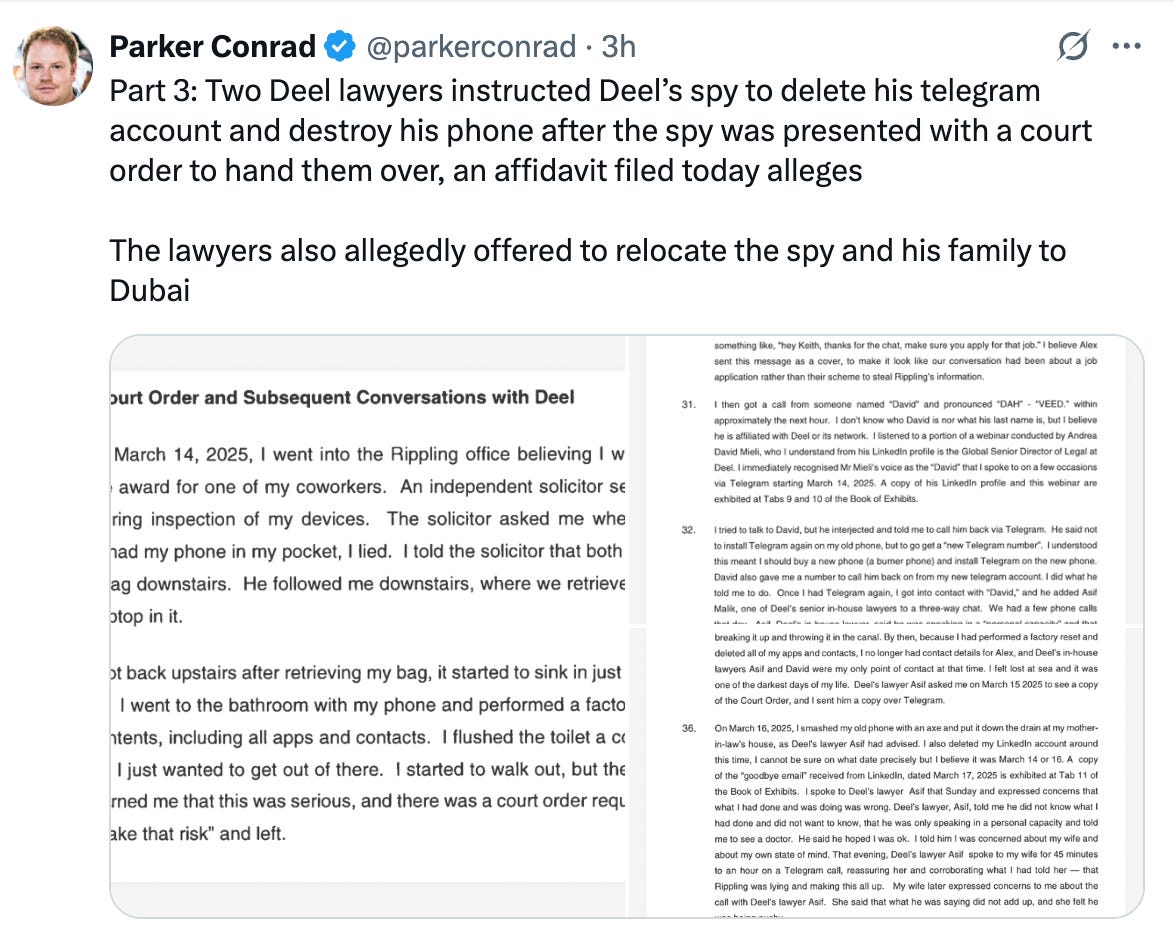 → Why does it matter? The Deel vs. Rippling corporate espionage case reads more like a Netflix script than a startup dispute. A former Rippling employee allegedly flushed his phone down the toilet and fled to Europe—only to be offered relocation to Dubai by Deel’s legal team, according to court documents.