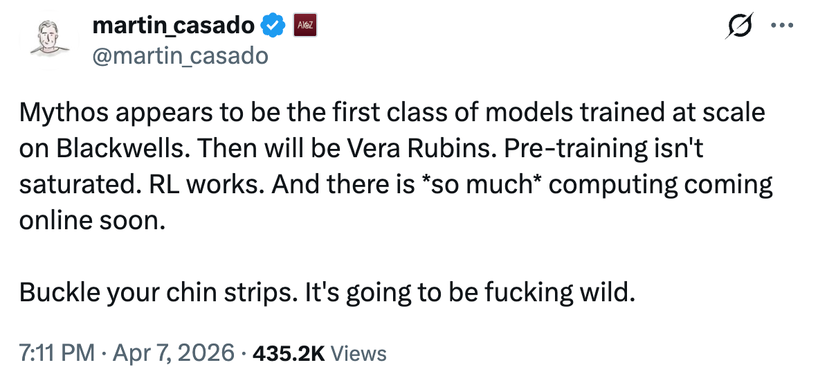 → Why does it matter? Anthropic posted benchmark numbers that are turning heads with Mythos. This is the first model trained on Blackwells. Buckle up!