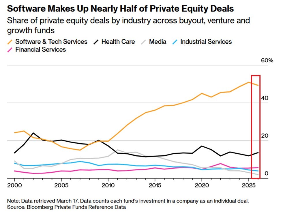 → Why does it matter? Nearly half of all private equity deals now target software and tech services, a share that has doubled over the last 15 years and is at an all-time high. This is also what has people concerned about private credit. If AI compresses the value of legacy SaaS products the way SaaS compressed the value of on-premise software before it, the unwind may not be contained to a single fund or vintage year.