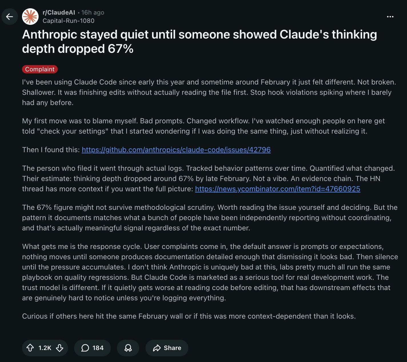 → Why does it matter? A user logged actual behavior data showing Claude’s reasoning depth dropped 67% in late February. Anthropic stayed quiet until the numbers were too documented to dismiss. The working theory among many users: Anthropic is throttling Opus to push traffic toward training its next flagship model.