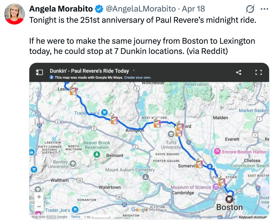 → Why does it matter? Seven Dunkin stops turn a legend into a commute. Have to love the USA.