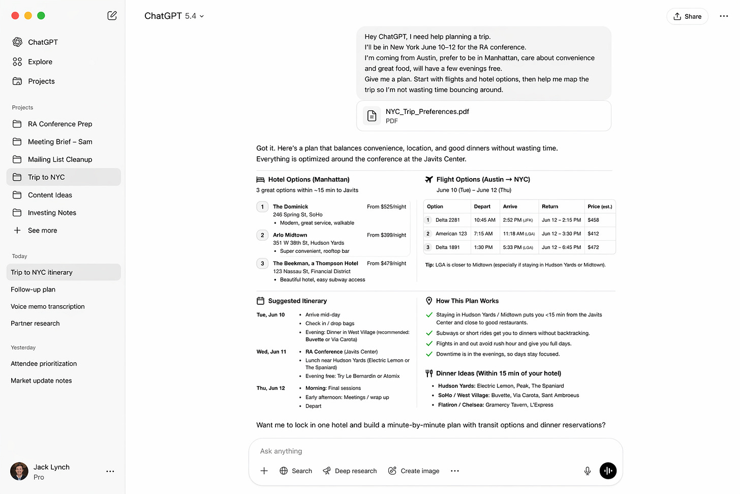 “Hey ChatGPT, I need help planning a trip. Here are my dates, where I need to be, who’s coming, and what matters most. Give me a plan. Start with flights and hotel options, then help me map the trip so I’m not wasting time bouncing around.”