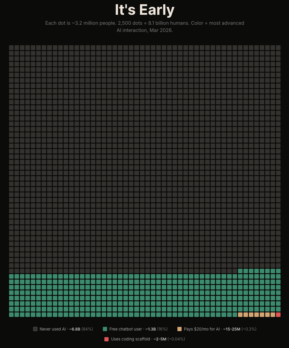 A lot of people may have tried AI now. Very few are using it anywhere close to its potential. In fact, the group using Agentic Coding is tiny, about 0.04% of the world’s total population.
