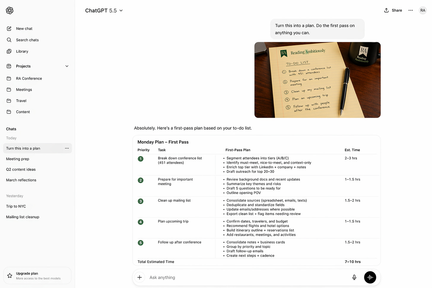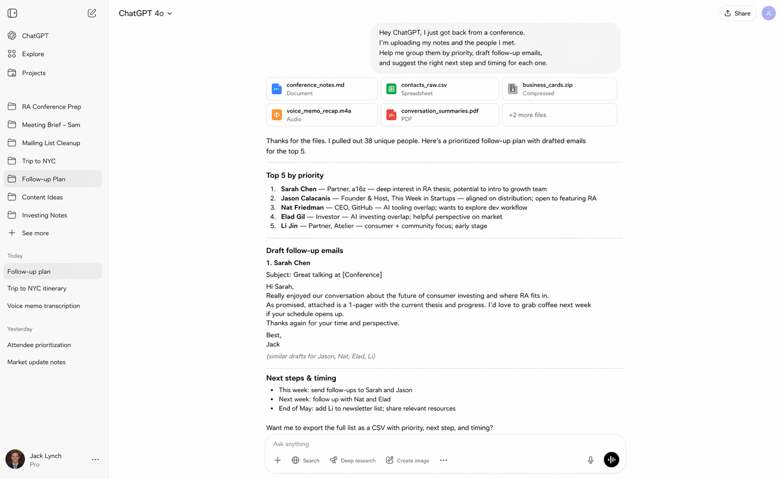 “Hey ChatGPT, I just got back from a conference. I’m uploading my notes and the people I met. Help me group them by priority, draft follow-up emails, and suggest the right next step and timing for each one.”