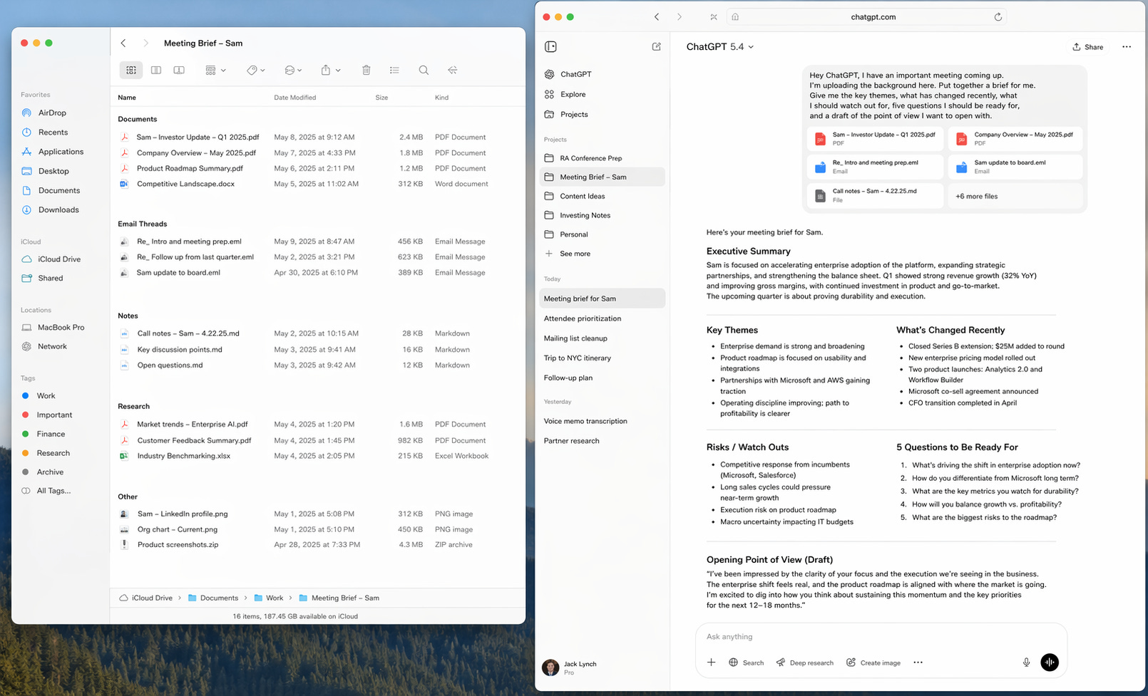 “Hey ChatGPT, I have an important meeting coming up. I’m uploading the background here. Put together a brief for me. Give me the key themes, what has changed recently, what I should watch out for, five questions I should be ready for, and a draft of the point of view I want to open with.”