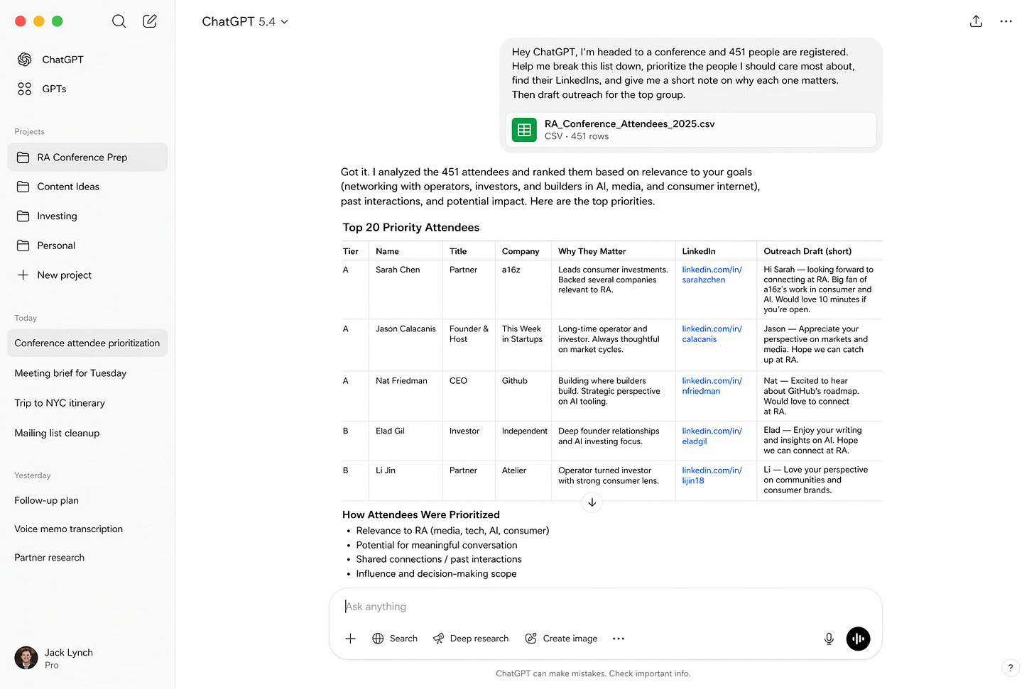 “Hey ChatGPT, I’m headed to a conference and 451 people are registered. Help me break this list down, prioritize the people I should care most about, find their LinkedIns, and give me a short note on why each one matters. Then draft outreach for the top group.”