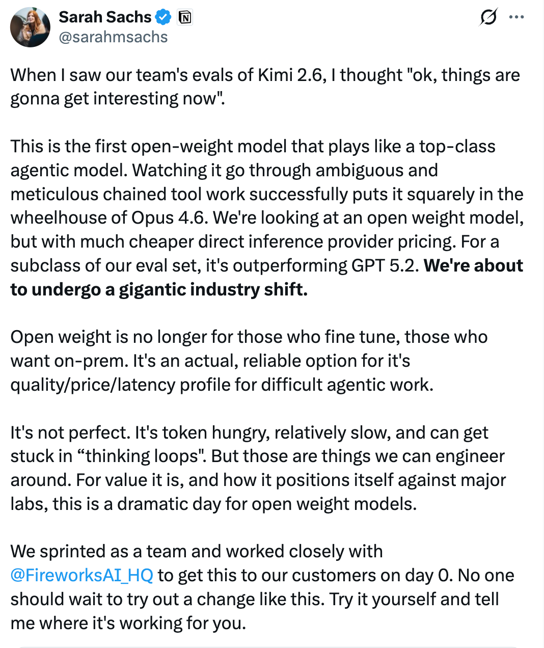 → Why does it matter? Kimi 2.6 is the first open-weight model competitive with top closed models on agentic tasks, at cheaper inference costs. I truly think open source could be the black swan in this whole thing.