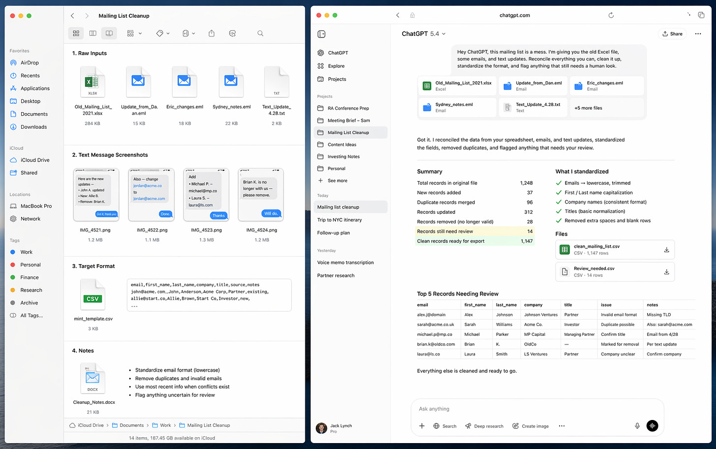 “Hey ChatGPT, this mailing list is a mess. I’m giving you the old Excel file, some emails, and text updates. Reconcile everything you can, clean it up, standardize the format, and flag anything that still needs a human look. Oh, and please give me the final output in XLS. Thank you.”