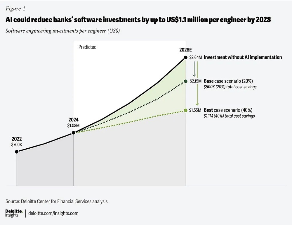 → Why does it matter? AI is emerging as a powerful deflationary force in software engineering—and the stakes for financial services are massive. According to Deloitte, banks could save up to $1.1 million per engineer by 2028 through AI adoption, cutting software investment costs by as much as 40%. That’s not just incremental efficiency. In a sector where margins are tight and talent is expensive. The institutions that embed AI deeply into their engineering workflows won’t just move faster—they’ll outspend and outlast the ones that don’t.