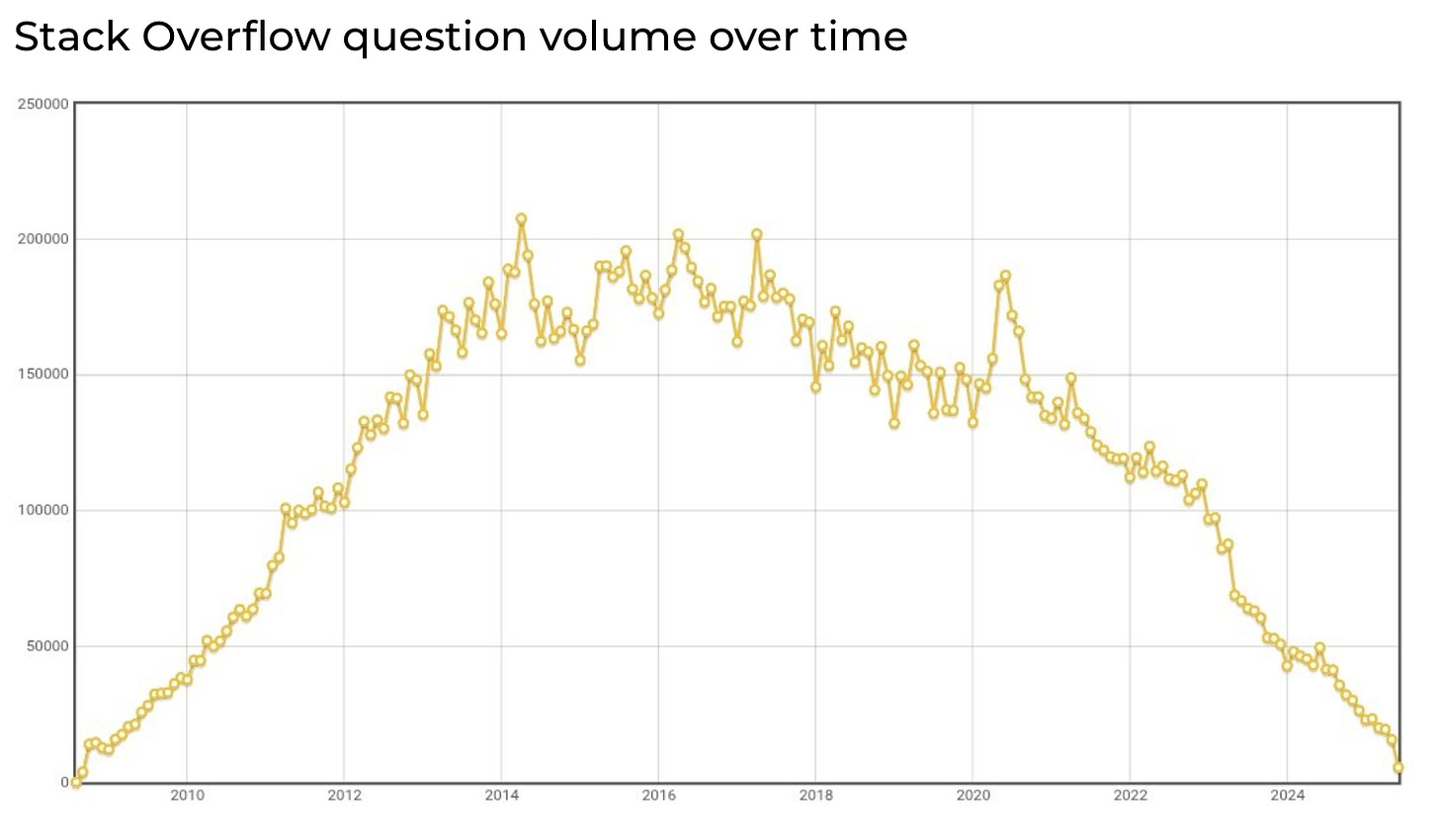 → Why does it matter? Stack Overflow’s sharp traffic decline—down more than 50% since 2022—is a striking signal of how fast generative AI is reshaping knowledge work. Once the go-to destination for developer Q&A, it’s now being cannibalized by AI assistants like ChatGPT and Cursor, which offer faster, more contextual answers. This isn’t just a shift in user behavior. It’s a preview of what happens when the internet’s knowledge base, built by humans, becomes the training ground for models that then replace it.