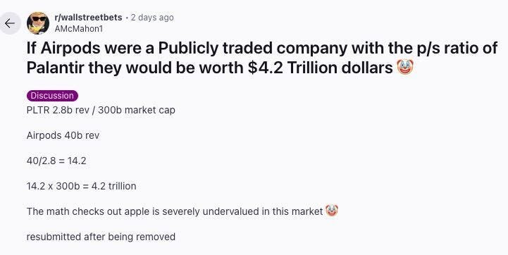 A post on r/WallStreetBets caught my eye the other day. It said if AirPods were a standalone company and were valued like Palantir based on p/s ratio they’d be worth $4.2 trillion. 🤯